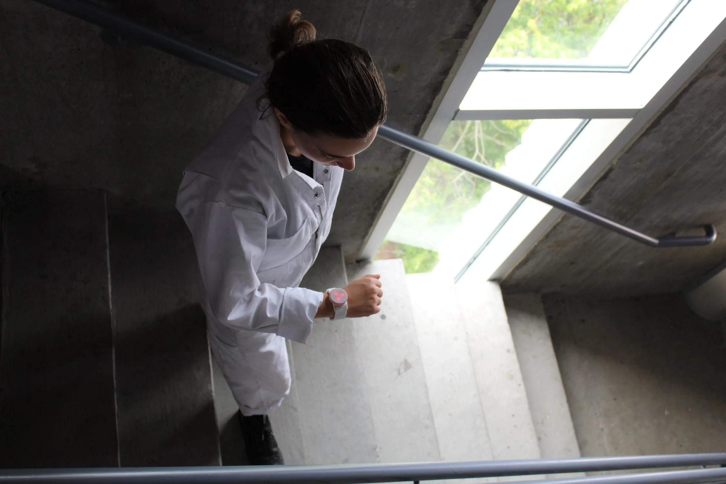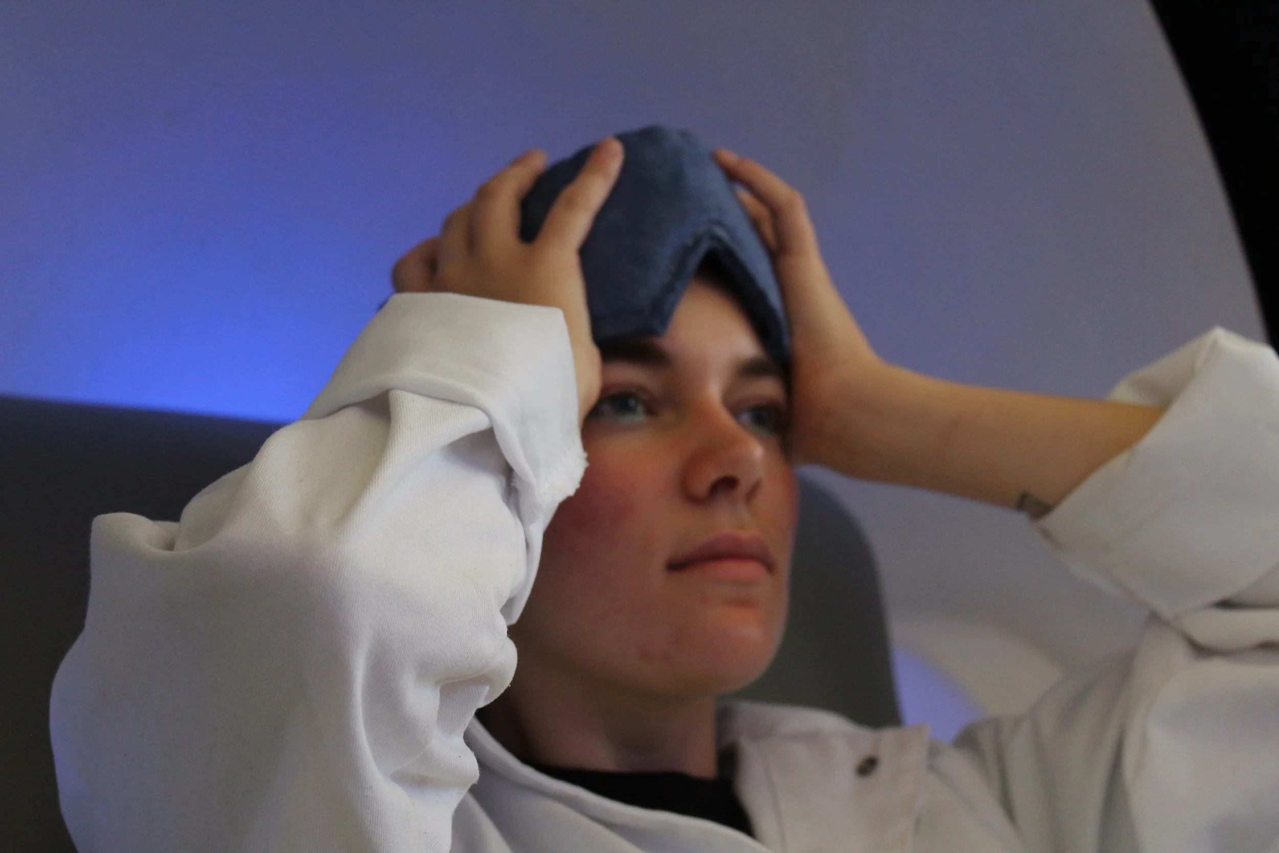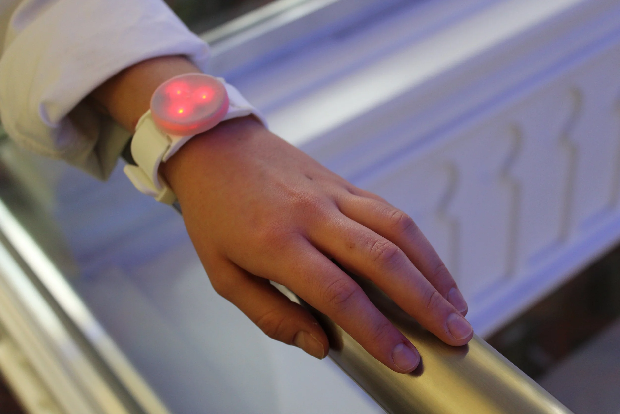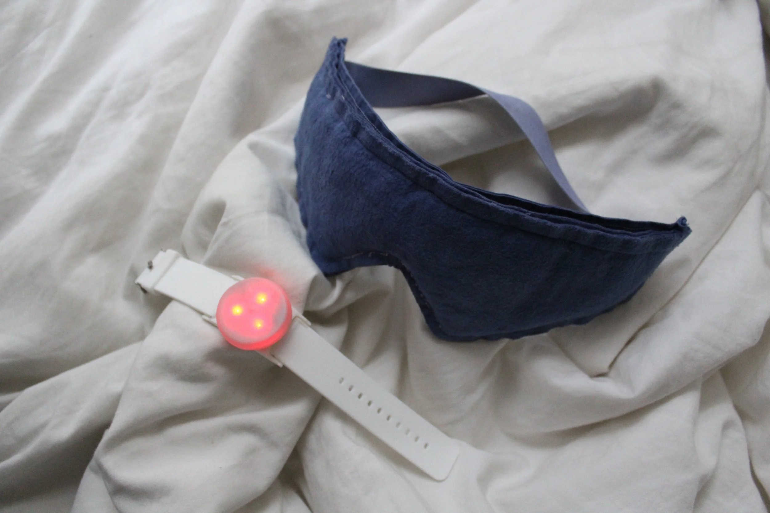 I compared fabrics based on tactile qualities, structure, and integrity after being dyed for the mask component. The wearable wrist device was made with silicone molding and casting, thermoforming, and installing small LED lights inside.