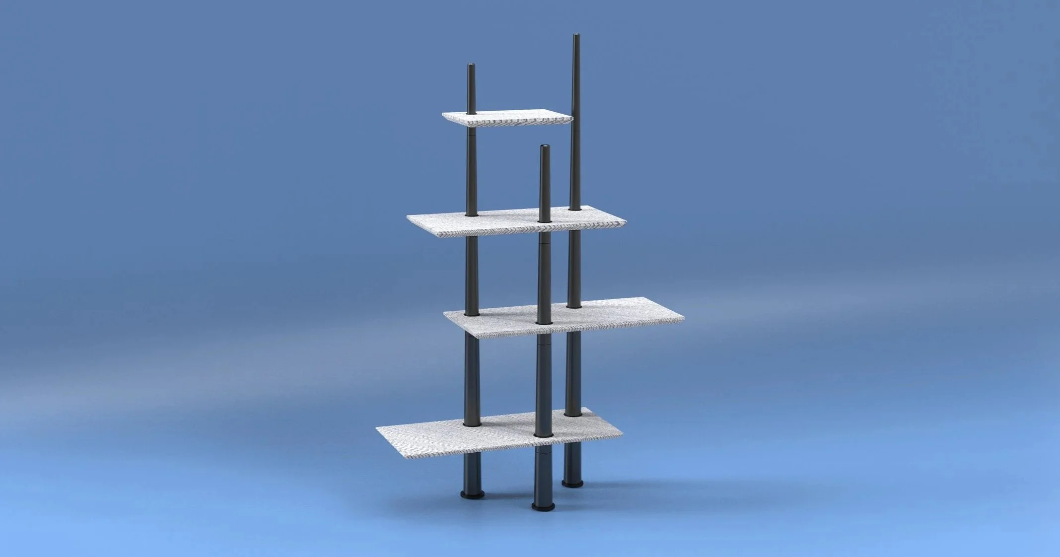 We decided to use ocean plastic and newspaper wood for the shelves because they repurpose existing matter. Newspaper wood has a matte finish and can be cut, milled and sanded like regular wood. Ocean plastic is available in a variety of colors and transparencies. We chose recycled anodized aluminum for its light weight and its resistance to corrosion and abrasion, and natural rubber for its strength and resistance to cutting or tearing. All materials were chosen based on their longevity and ability to be repurposed or decompose.