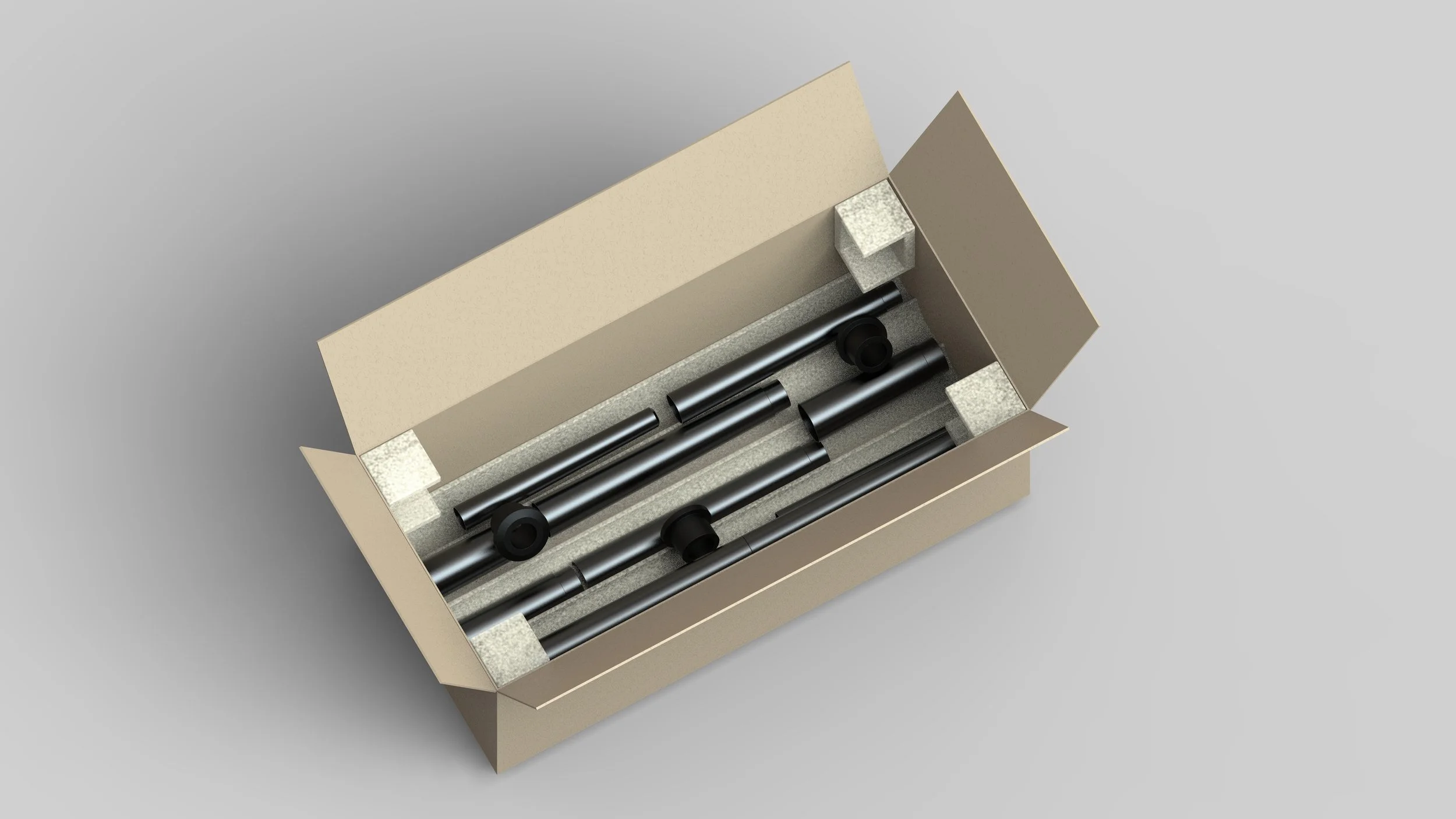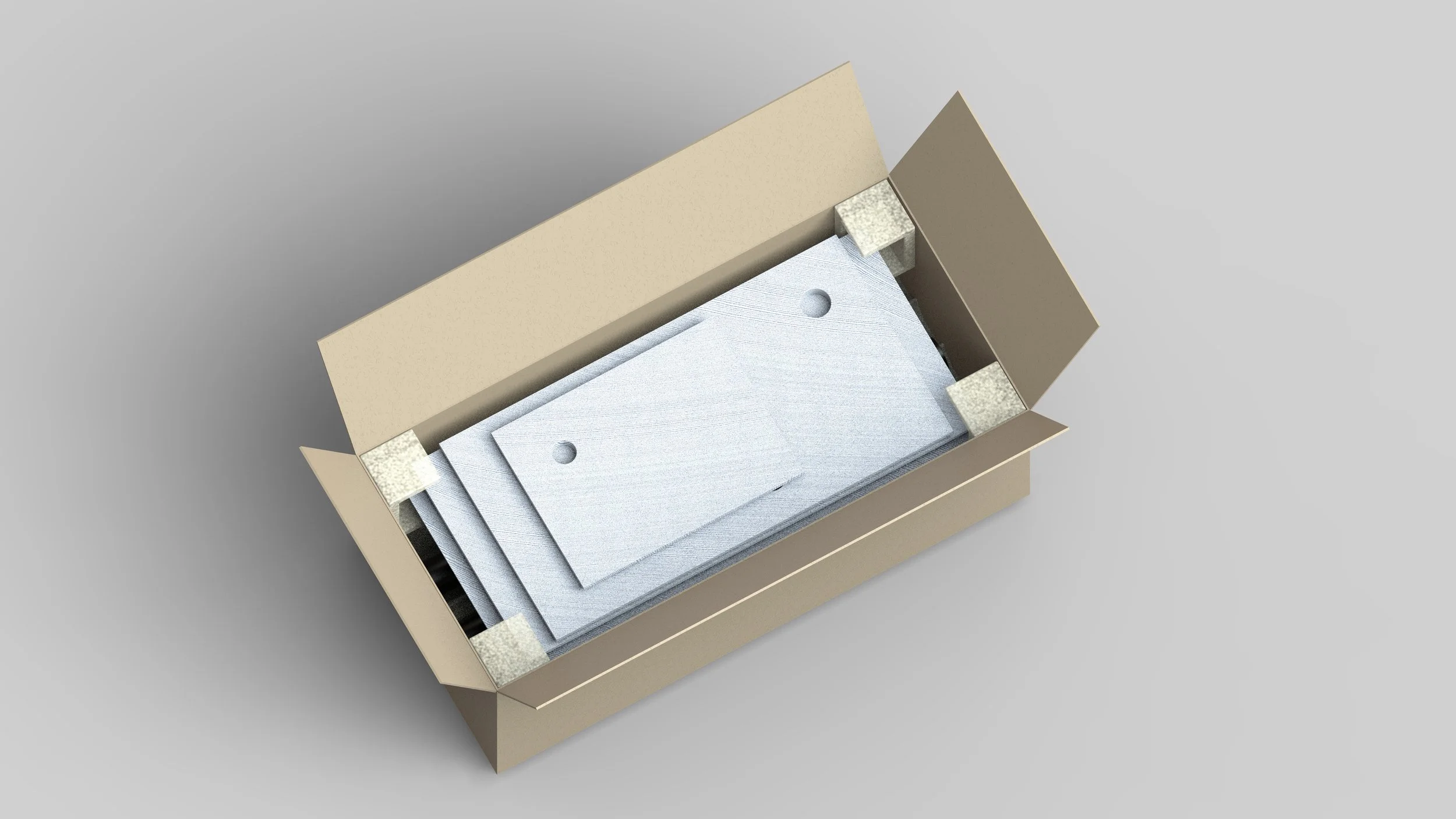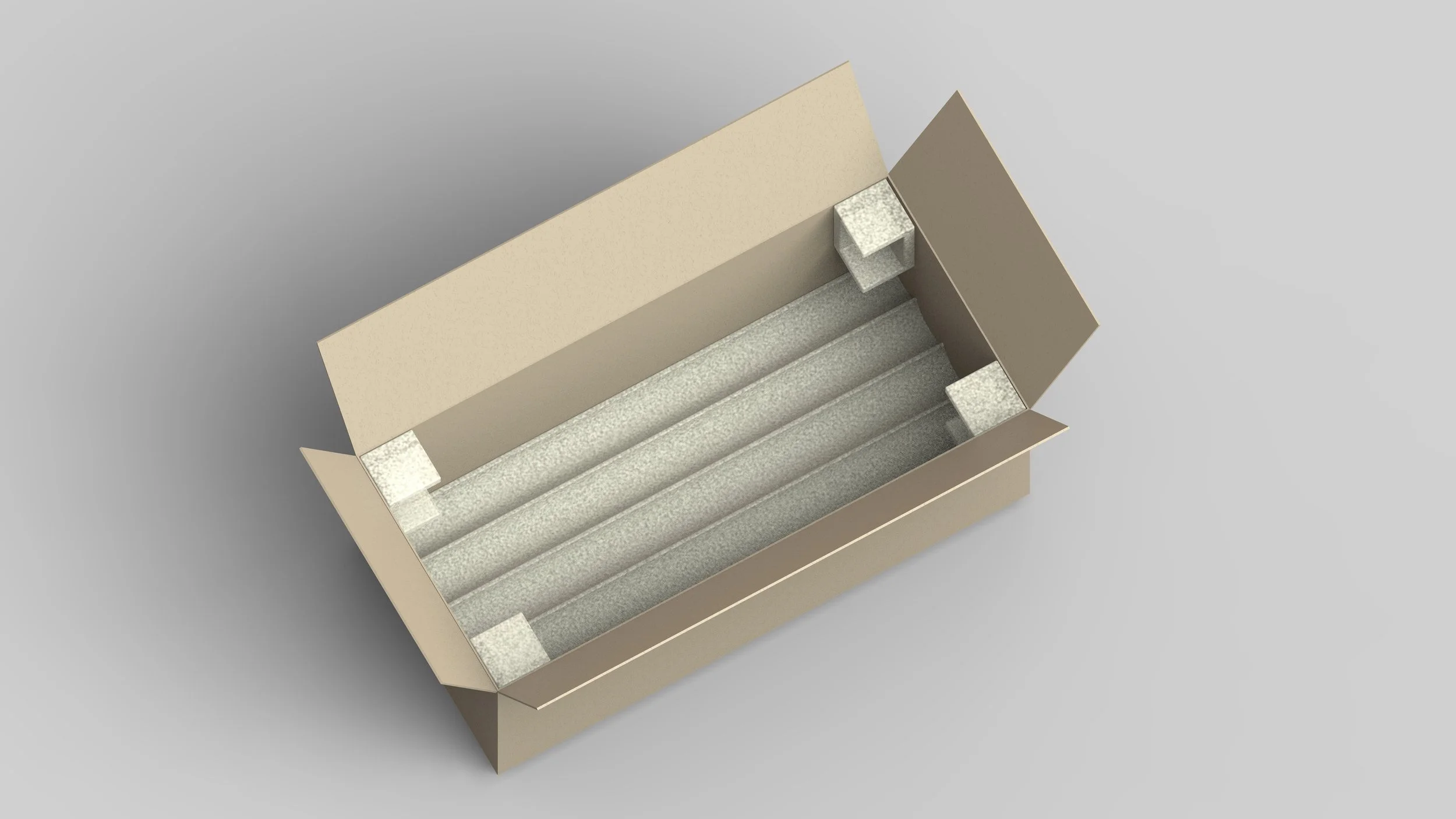 Materials for packing include a cardboard box lined with mycelium blocks to keep the parts in place during shipping. Mycelium is a sustainable alternative to plastic or styrofoam. It is made of organic living matter grown in an airtight mold to fit a custom shape. After use, it is able to be composted without chemicals.